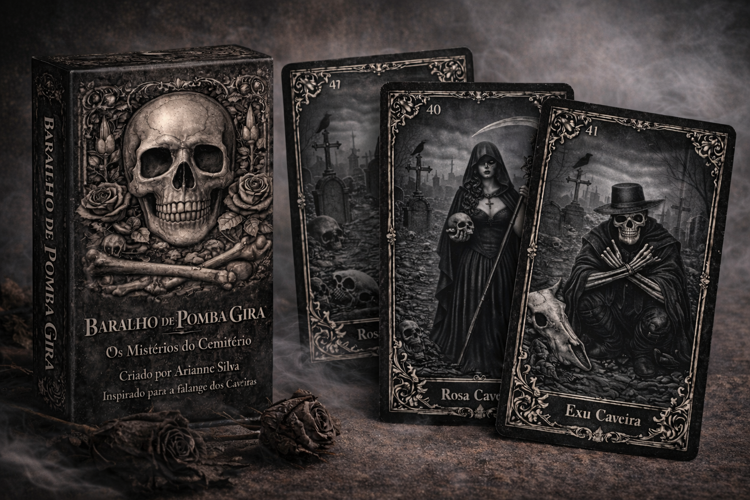 A energia de Dona Rosa é profundamente ligada ao cemitério, não como um lugar de medo, mas como um espaço de consciência, passagem, memória e verdade. Existe algo mais sóbrio, mais direto e mais silencioso nessa atuação. E foi exatamente essa energia que pediu um baralho diferente.